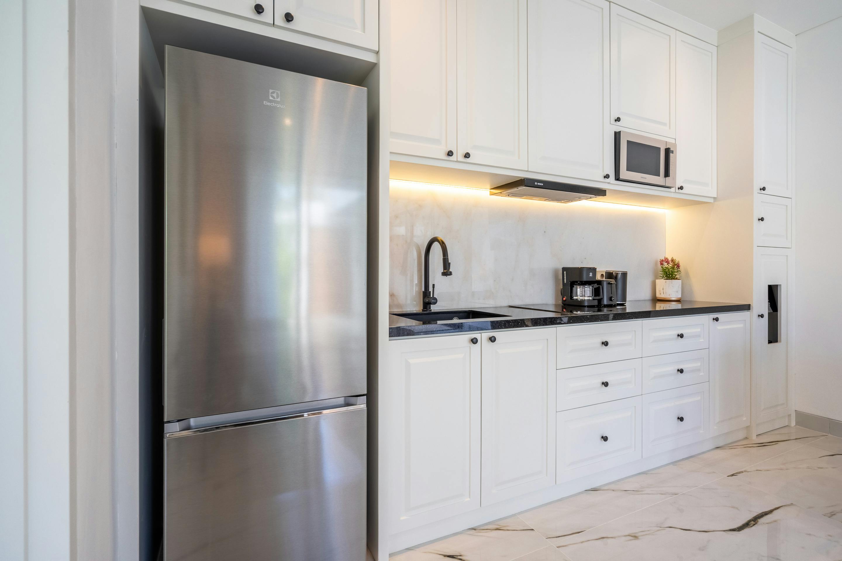 The expansive living area features floor-to-ceiling sliding glass panels that fully open, seamlessly connecting the air-conditioned interior with the tropical outdoors. The modern, fully equipped kitchen showcases premium Duco finishes and top-of-the-line appliances, ideal for effortless dining and entertaining.